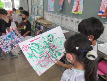 図画工作科「絵の具+水+ふで=いいかんじ!」の学習で,絵の具でいろいろな描き方できることを確認した後,自由に色を混ぜたりいろいろな線や形を描いたりしました。絵の具につける水の量を変えたり,筆の持ち方をいつもと違うように持ったり,込める力の強さを変えたりしました。できあがったものを見て,何の形ができたか,どんな形に見えるのかを考えました。