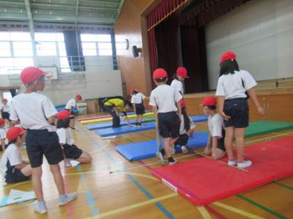 3年生は5種目のテストを行う予定で,1日目は「反復横跳び」と「立ち幅跳び」をしました。今もっているスピードと跳躍力を,出し切りました!