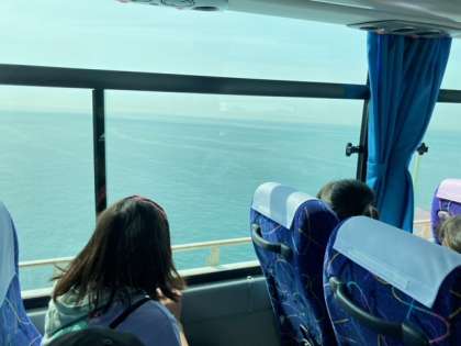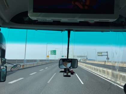 明石海峡大橋を通過して淡路島に向かいます。眼前に広がる海に驚きの声があがっています。