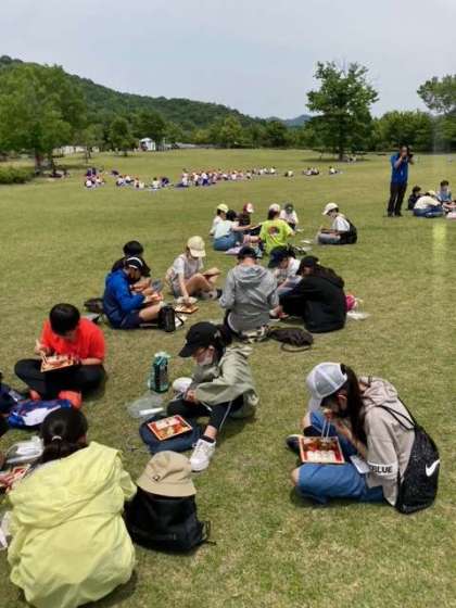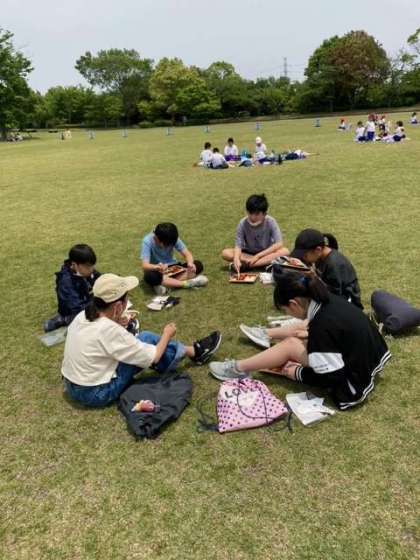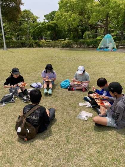 広い芝生広場で食べています。