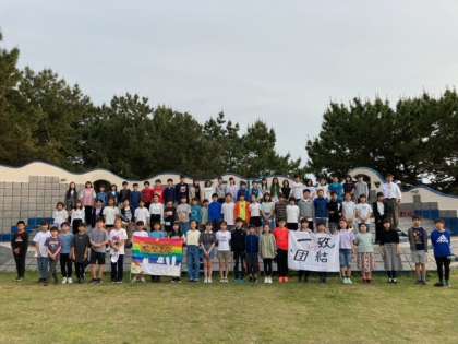 海岸で学年写真を撮りました。みんないい笑顔です。