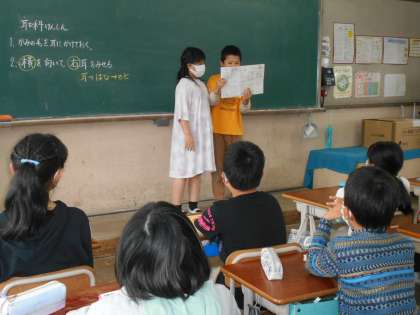 これは,第一回代表委員会後の計画委員2人からの報告の様子です。5年生から始まった委員会ですが,それぞれの委員会で常時活動にしっかりと取り組んでいる5年生のみなさんです。6年生と共に,葛野小学校をしっかりと支えていってくれるのではないかなと思います。がんばれ!5年生!!