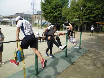 「やったー!さかあがりできた!」「足かけあがりってどうやってできるの?」体育では現在鉄棒の学習をしています。組んだペア同士で技カードを見ながら,一生懸命取り組む姿はさすが5年生です。実際にやってみながら教えあうペアもいたり,しっかり技カードを読み込んでいるペアもいたりして,意欲的に学習しています。一つでも新しい技を獲得して6年生に上がってほしいです。
