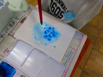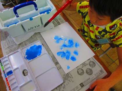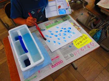 初めての絵の具を使った学習の様子です。準備や片付けも初めてなので丁寧に説明し学習を進めていきました。