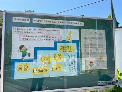 正門の掲示板には,月の行事予定だけでなく,
