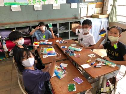今回の図工では,小さい画用紙に直接絵の具を出して,指でまぜました。