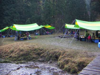 雨を防ぐために,前日にテントのようなものをたて,中にテーブルをセットし,みんなで食事をしました。