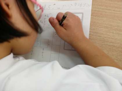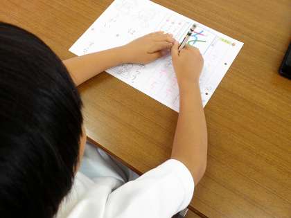 書き順をホワイトボードで確かめてから,10分間書く学習をしています。