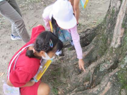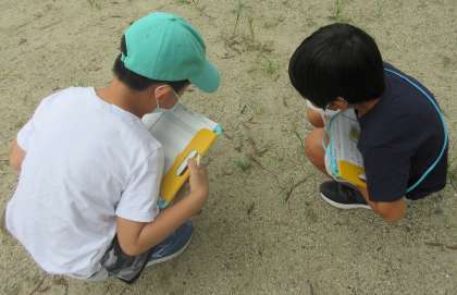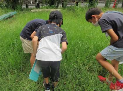 理科「動物のすみか」の学習で、動物たちはどんなところにいて、何をしているのかを調べるために、三反田公園に観察しに行きました。トンボやバッタ、アリ、ダンゴムシたちのすみかを見つけて、何をしていたのかをじっくり観察しました。