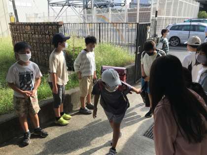 今日は4年生の代表員の子ども達が、裏門に立って、