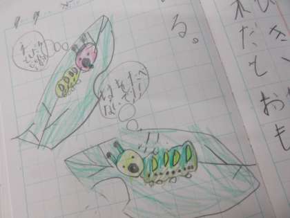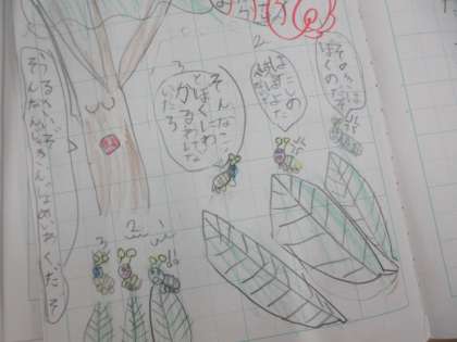 国語では,あおむしが出てくる「やくそく」というお話を学習しました。3びきのあおむしの気持ちや様子を考えたり,文から読み取ったりして,ノートにまとめました。