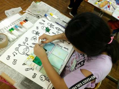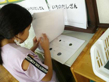 色塗りをした子は,以前取り組んだ色の足し算を見て,緑やピンクを作り塗ることもできました。