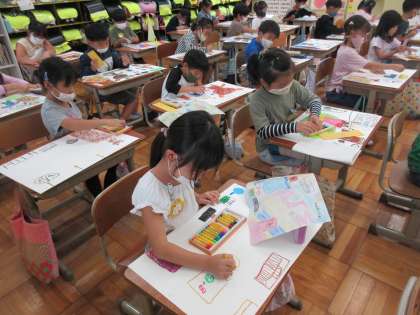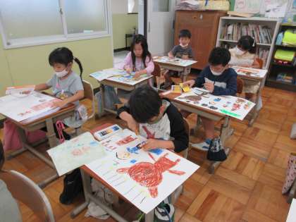 絵本を読み聞かせをして,どんな登場人物かな?と想像をふくらまでながら絵を描きます。