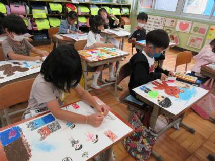 クレパスやコンテ,絵具など,使って絵を描いています。完成が楽しみです!