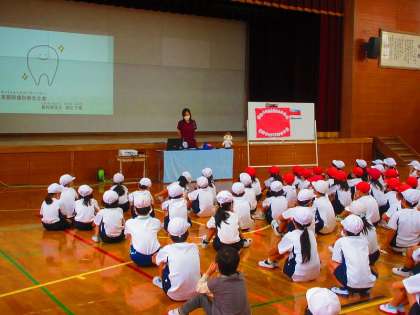 2時間目に体育館にて、歯みがき指導がありました。堀江先生という女性の歯科衛生士さんが分かりやすく教えてくれました。