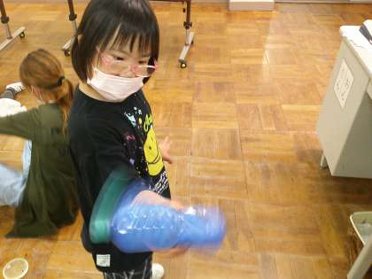ペットボトルに絵の具を入れて「ぶどうジュース。」を作り,みんながわかるようにラベルを付けてぶどうの絵を描く姿も見られました。