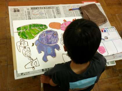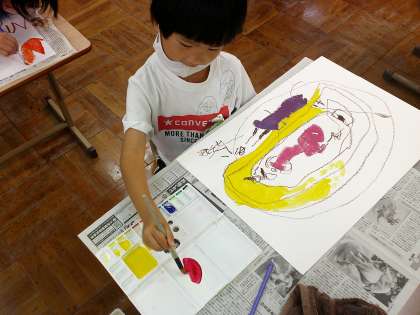 5色の絵の具を使って,お話の絵を描いています。