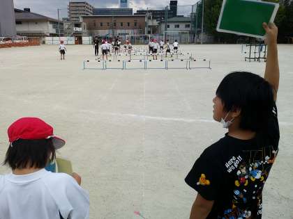 ハードルの間隔を友達にカードを使って伝えている様子です。