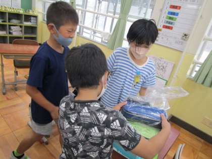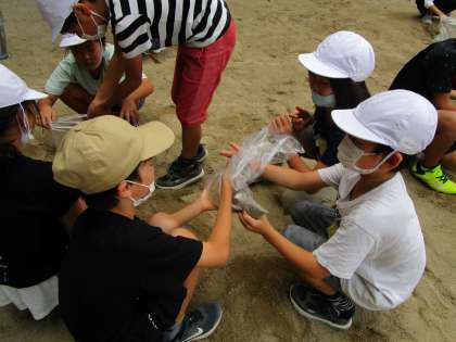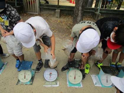初めに教室で1kgの重さがどれぐらいなのか身近な物で確認,そして砂場で1kgと思う重さの砂を袋に入れました。
