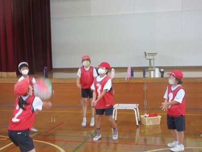 友達の輪に入り,ボールを投げて手渡したり,アンダーハンドパスをしてみたりと積極的にボールに触っていました。