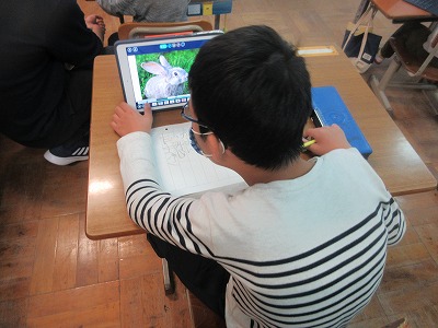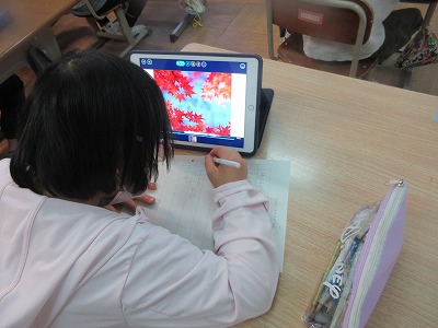 タブレットで音声を聞き,イラストを見て,言葉を書いています。