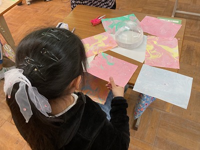 今日は,和紙を貼る型を作ったり,マーブリングの和紙を貼ったりしました。