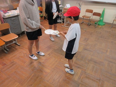作成したお玉を使って,ピンポン玉を友達のもとへ運びました。