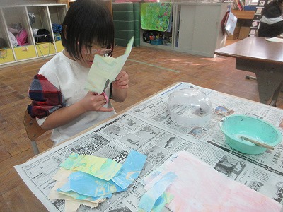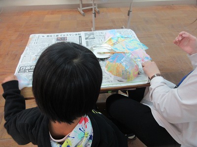 マーブリングで作った用紙を切ったり破いたりしながら小さくして,ペタペタとボンドを塗り型に貼り付けていきました。来週の月曜日にライトを入れて,照らす予定です。