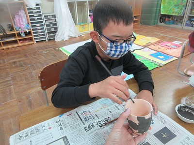 清水焼の湯飲みに自由に筆を走らせて,素敵な模様を描くことができました。