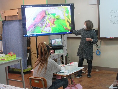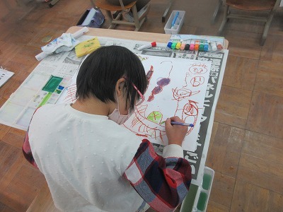 サツマイモの葉,茎を中心に色を塗りました。色の足し算を参考にして,「青と黄色で緑。」と言って,色を作っていました。緑でも混ぜる量によって色が違い,いろいろな緑を作って塗ることができました。