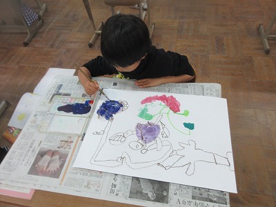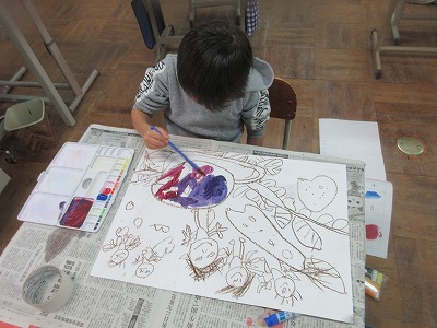 サツマイモの絵を描きました。色を混ぜて作り,色を加えながら塗ることができました。コンテをハサミで削って背景を彩る子もおり,素敵な作品ができました。