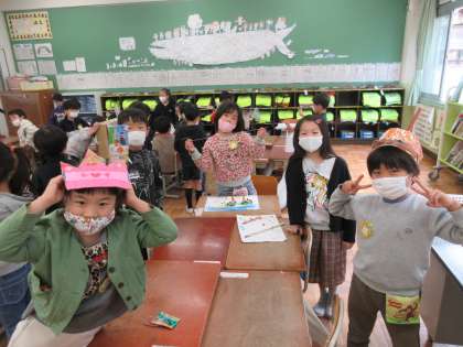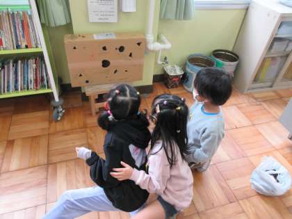自分の作った秋遊びで作ったものでお友達が楽しそうに遊んでいる様子を見て,嬉しそうでした。