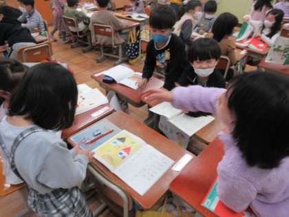 国語科では,自分の思いをペアで伝え合ったり,グループで伝え合ったりしています。