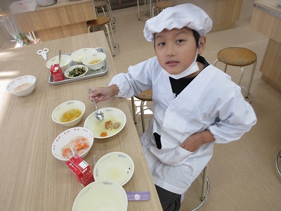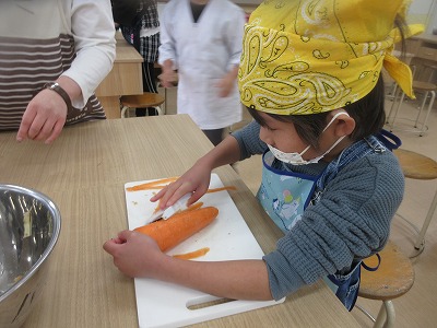 野菜を切る係・ピーラーで皮をむく係・水や牛乳の量をはかる係等,役割分担をして取り組みました。それぞれが役割を把握して,活動することができ,おいしいシチューができました。