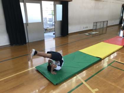 倒立ブリッジ、首はね起きなど、難易度の高いものにも挑戦。