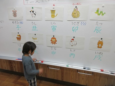 映像を見ながら,干支を確かめ,最後はみんなで「子丑寅・・・・。」と読みました。
