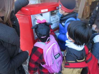 国語で年賀状を書く学習をしました。今日は,書いた年賀状を郵便局に出しに行きました。ポストには年賀状と年賀状以外の入れるところがあり,説明を聞いて年賀状のところに入れることができました。