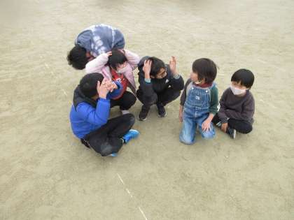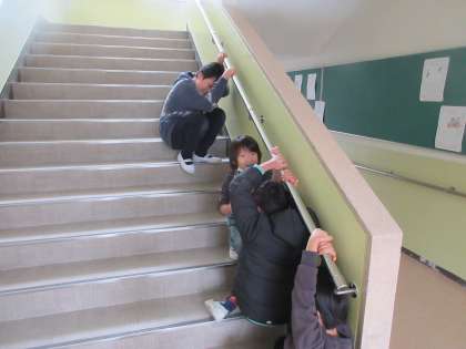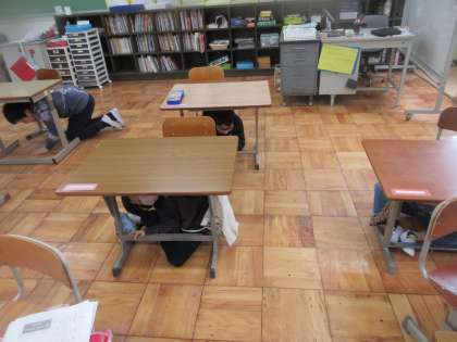 避難訓練前の学習の様子です。事前に地震が起こるとどうしたらよいかを運動場や教室で確かめました。机の下に隠れたり,運動場の真ん中で座って頭を守ったりしました。