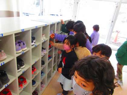 靴箱の上靴と下靴を入れるところを確認しました。まだまだ、校舎の工事は続くので上靴で歩ける範囲と下靴で歩く所を知りました。