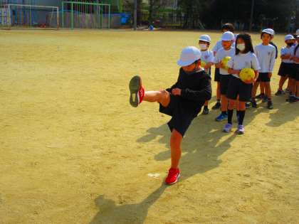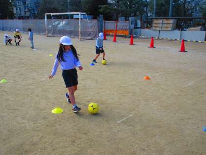 今日は、パス・ドリブル・シュートの練習をしました。来週は、転がってきたボールでシュートの練習をします。
