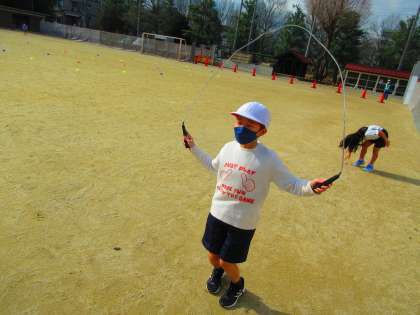 パスゲームの前には準備運動として、なわとびをしています。できる技のレベルアップに取り組んでいます。