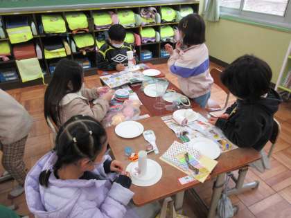 保護者の皆様。いつもたくさんの材料を準備して頂いてありがとうございます。材料がたくさんあると,子どもたちが作品を作る時の幅も広がり,試行錯誤する様子も多く見られます。ありがとうございます。