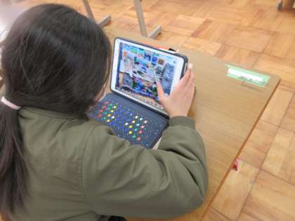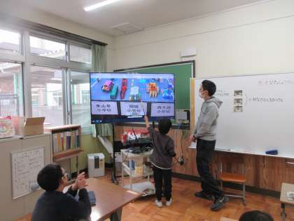 5時間目,授業を変更して「小さな巨匠展」の他校の作品をロイロノートでふりかえりました。作品を見ながら,好きな作品を選び「食べ物がおいしそう。」「電車のタイヤがふわふわしてる。」等,発表することができました。