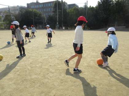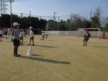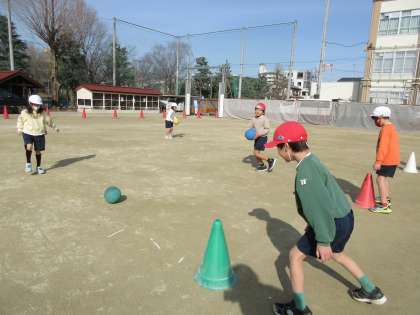 コーンにボールを当てたり,決められた枠の中を動いたり…