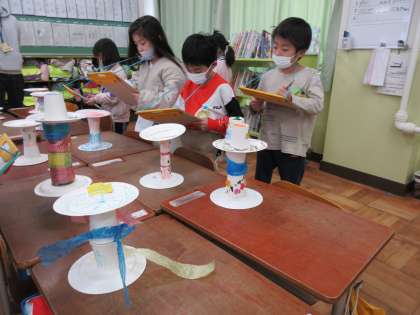 みんなの作った紙皿コロコロを鑑賞会で見合いっこしました。