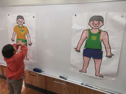 「性教育」で男女の違いやプライベートゾーンについて学習しました。大きな男女のイラストを見て違いを考えていました。