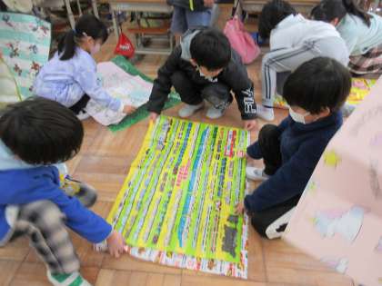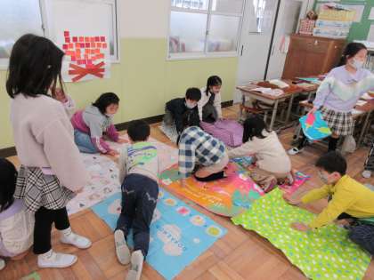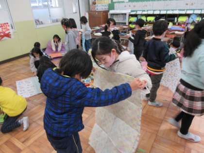 「どうすれば広さがわかるかな?」と聞くと,「縦と横を比べたほうがいい!」とみんなが比べる方法を見つけてくれました。
