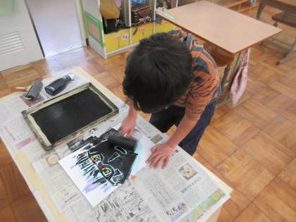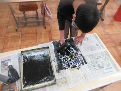 紙版画をしました。目,鼻,口,眉毛等,顔のパーツを順番に作っていき,今日刷りました。