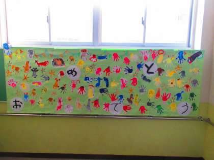 6年生と新1年生への「おめでとう」の横断幕を作りました。手形か足形を決めて、好きな動物を描きました。賑やかな幕が完成しました☆