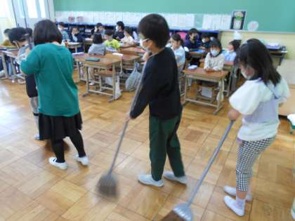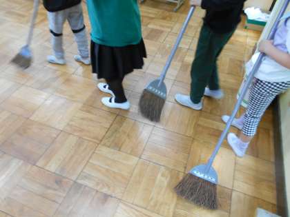今日から、給食だけでなく掃除も始まります。ほうきの掃き方や掃除の場所を各クラスで確認しました。